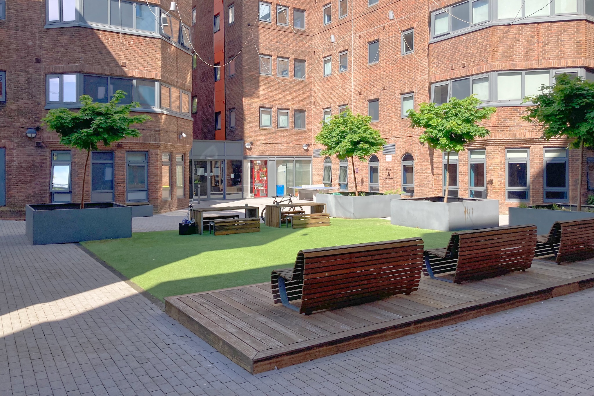 Wash entire block paved courtyard. Wash raised wooden seating platform. Clean large metal planters.