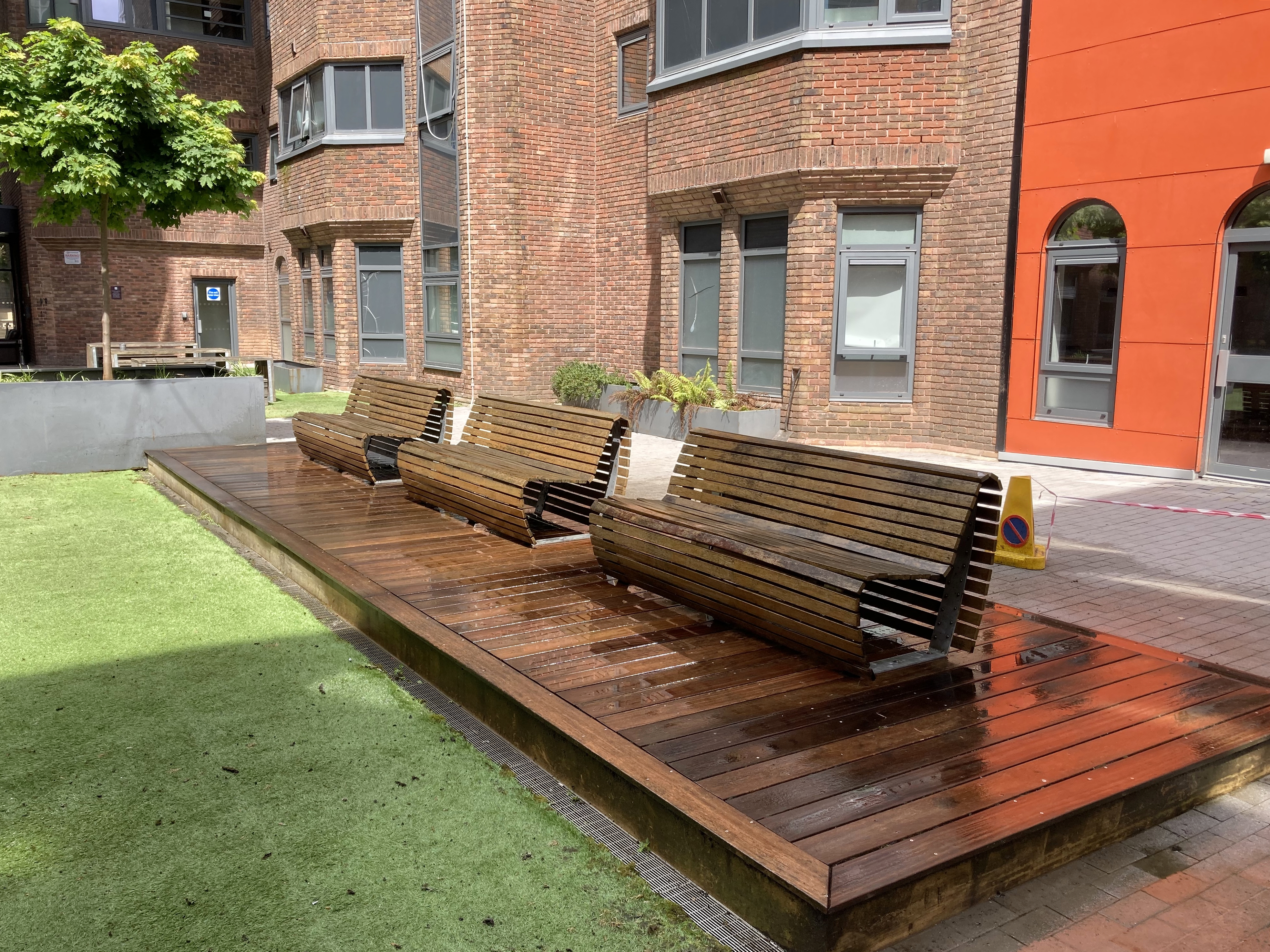 Wash entire block paved courtyard. Wash raised wooden seating platform. Clean large metal planters.
